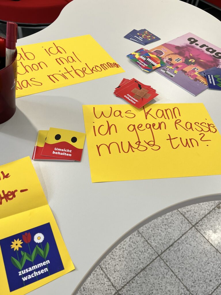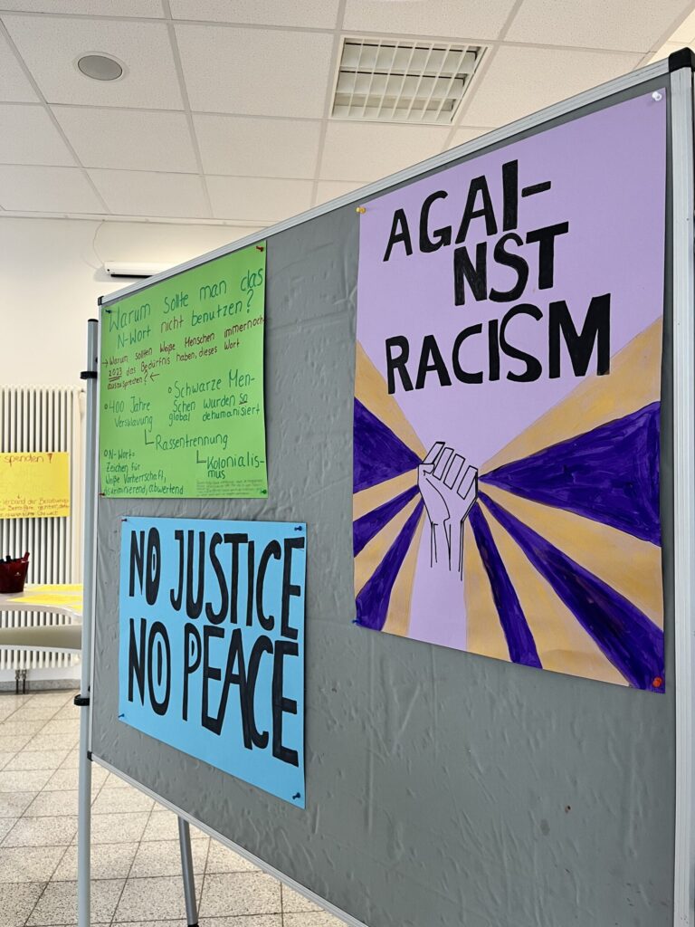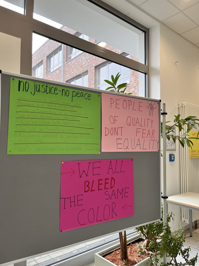 Für die Schülerschaft haben wir den 21. März gewählt, den internationalen Tag gegen Rassismus, um sie durch verschiedene Möglichkeiten, aufmerksam zu machen. Wir bereiteten verschiedene Plakate vor, welche aufklärend und plakativ gegen Rassismus und Ausgrenzung angehen sowie die Möglichkeit bieten, eigene Erfahrung zu diesem Thema zu teilen und miteinander ins Gespräch zu kommen.
