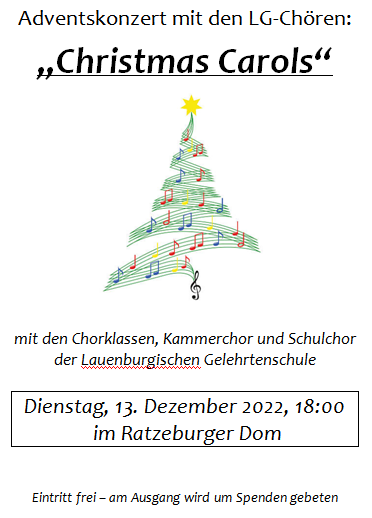 Am Dienstag, 13.12., 18:00, laden die Chorklassen sowie Schul- und Kammerchor der Lauenburgischen Gelehrtenschule zu einem Adventskonzert in den Ratzeburger Dom. Die Chöre präsentieren ein buntes, vorweihnachtliches Programm, auf das die letzten Wochen und Monate in wöchentlichen Proben hingearbeitet wurde. Ergänzt werden die Darbietungen der Chorgruppen durch Instrumentalmusik von Sophia Kaiser (Harfe) und Jakob Büschking (Klavier). Der Einlass beginnt gegen 17:30, das Konzert dauert etwa eine Stunde. Warme Kleidung wird empfohlen, da der Dom nur leicht beheizt wird. Der Eintritt zum Konzert ist frei – am Ausgang wird wie immer um eine Spende zur Unterstützung der Chorarbeit gebeten.
