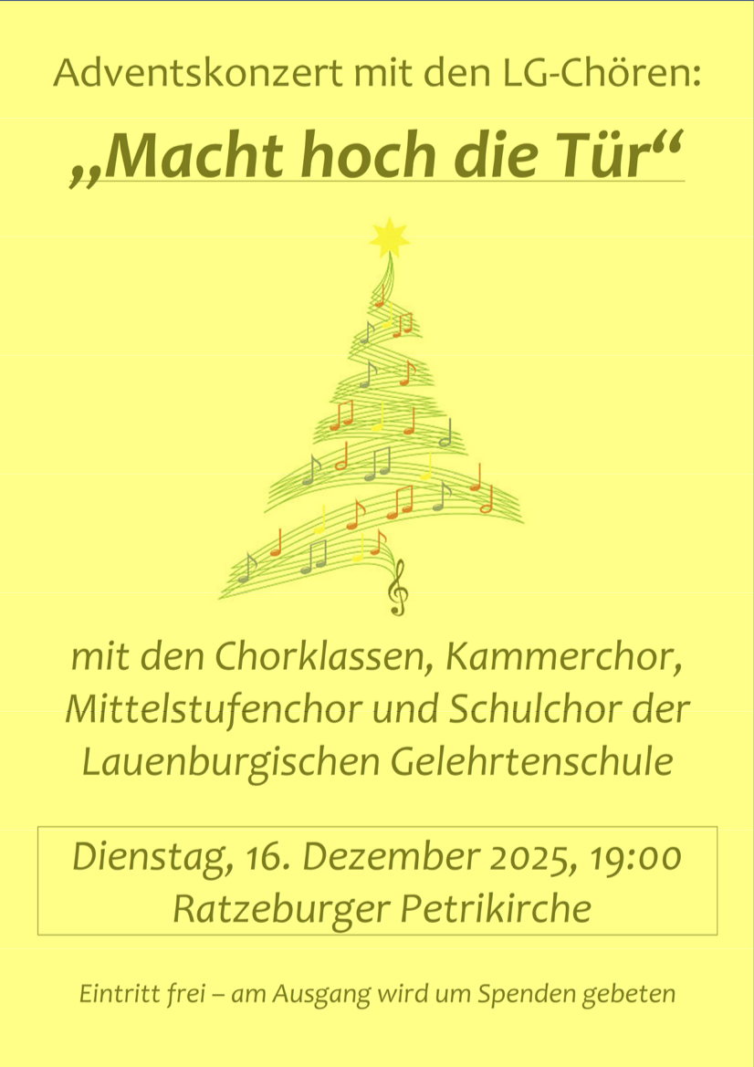 Am Dienstag, 16. Dezember, 19:00, laden die Chorklassen, der Mittelstufenchor sowie Schul- und Kammerchor der Lauenburgischen Gelehrtenschule zu ihrem traditionellen Adventskonzert in die Ratzeburger Petrikirche.