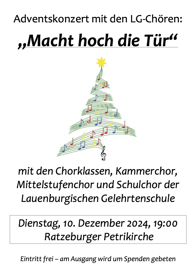 Am Dienstag, 10. Dezember, 19:00, laden die Chorklassen, der Mittelstufenchor sowie Schul- und Kammerchor der Lauenburgischen Gelehrtenschule zu einem Adventskonzert in die Ratzeburger Petrikirche.