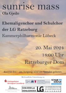 Am Pfingstmontag, 20.5.2024 singen knapp 150 ehemalige und aktive Chorist*innen der Lauenburgischen Gelehrtenschule gemeinsam im Dom. Zentrales Werk ist die „Sunrise Mass“ des norwegischen Komponisten…