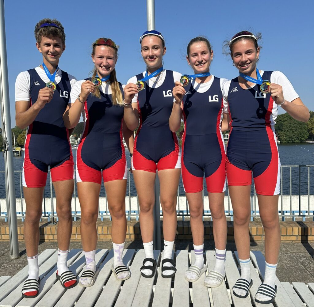 Gold für die Lauenburgische Gelehrtenschule Ratzeburg (v.li.): Felix Scharf, Emma Lange-Franzen, Elena Schweisthal, Emma Murach und Marie Hinzpeter genossen an der Regattastrecke in Berlin-Grünau den Erfolg auf dem obersten Siegertreppchen.