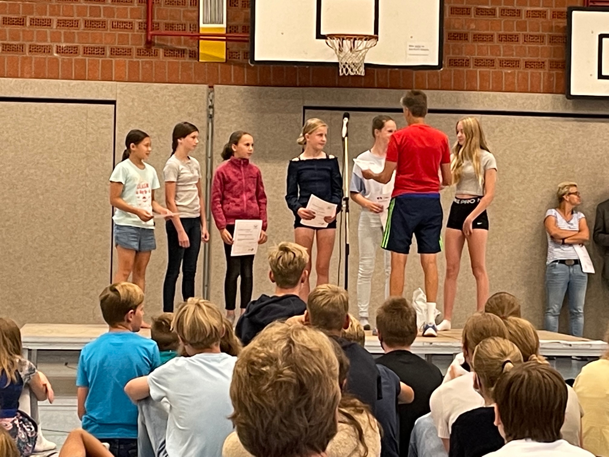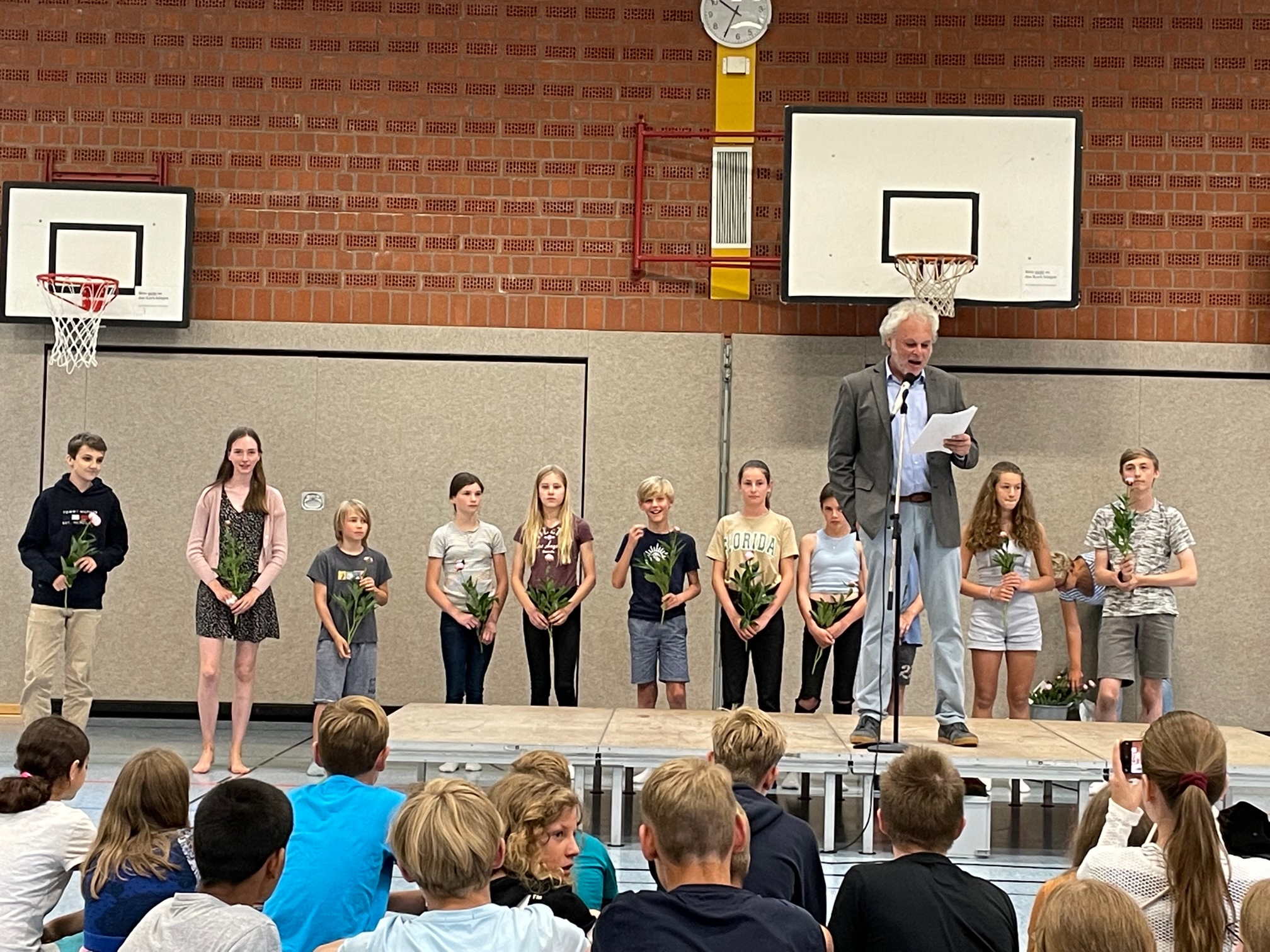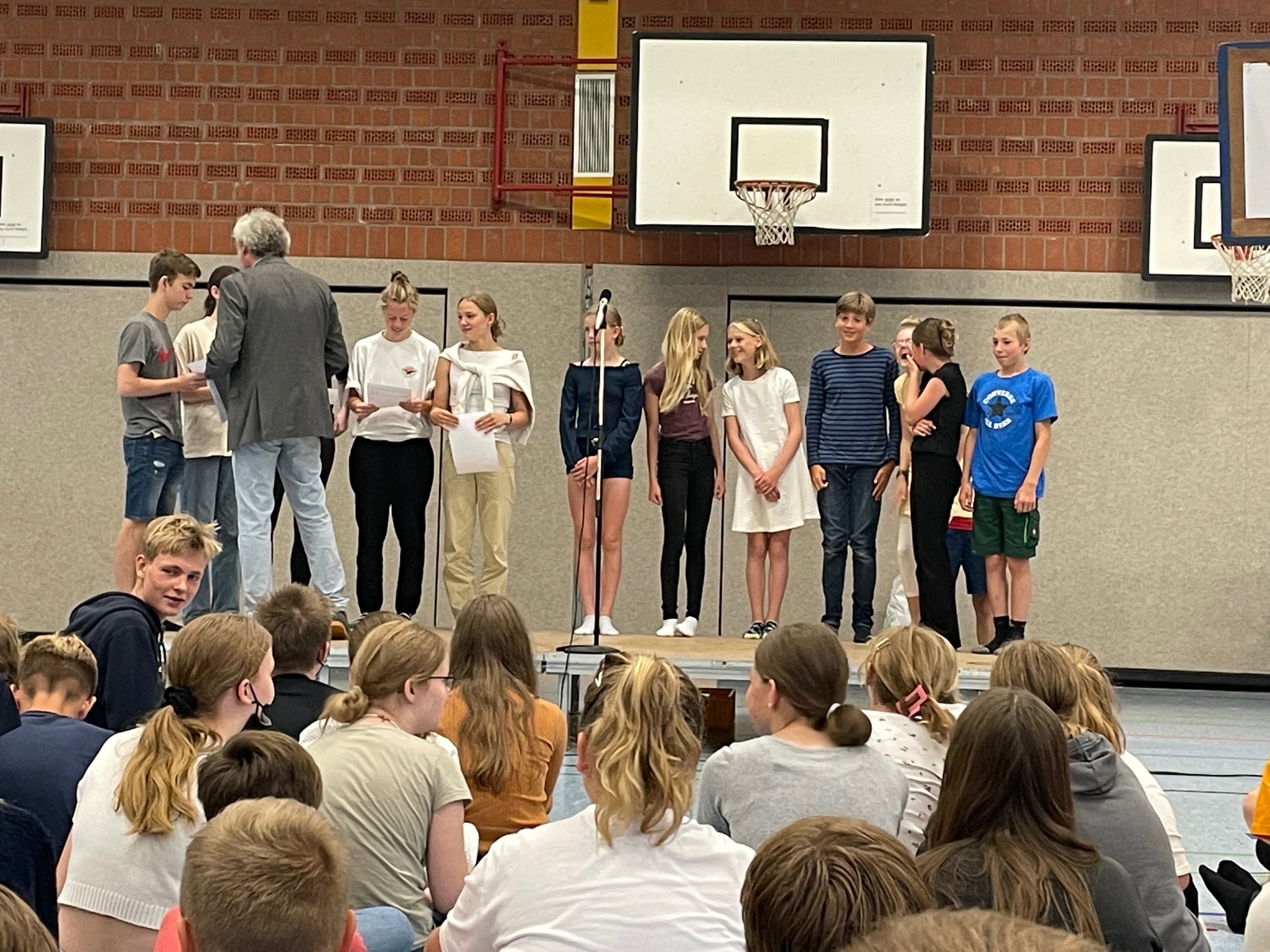 Kurz vor Ausgabe der Zeugnisse trafen sich noch einmal alle in der Sporthalle der LG, um all die Schülerinnen und Schüler gemeinsam zu ehren, die sich in diesem Schuljahr in besonderem Maße für unsere Schule eingesetzt hatten. Dabei machte die Schulsprecherin Angelina Schlecht zunächst deutlich,wie wichtig für alle ein gemeinsames, aktives Schullleben angesichts der großen aktuellen Verunsicherungen durch die Corona-Epidemie und den Krieg in der Ukraine ist. Unter großem Beifall wurden anschließend zahlreiche Schülerinnen und Schüler für ihr kulturelles oder soziales Engagement, ihre sportlichen Erfolge in verschiedenen regionalen und landesweiten Wettbewerben oder ihre herausragenden schulischen Leistungen geehrt!