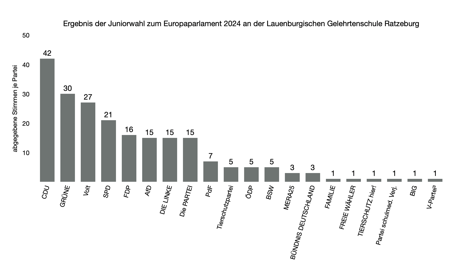 veröffentlicht. Alle Schülerinnen und Schüler, welche bezüglich ihrer Meinung zu dieser Aktion befragt wurden, waren sich einig: Die Juniorwahl ist ein lobenswertes Projekt für Schulen! Das Interesse der Schülerinnen und Schüler, noch mehr zu der EU-Wahl und politischen Wahlen allgemein zu erfahren, sowie sich mit den Parteien, die zur Wahl stehen, noch ausführlicher