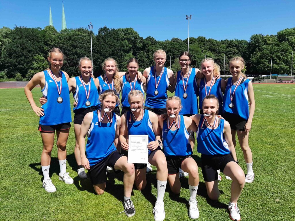 Gänsehautmomente gab es in Lübeck viele. Da trommelten die WII-Jungs ohne mit der Wimper zu zucken ein zweites Mal ihre schnelle 4x100m-Staffel auf die Bahn, nachdem die elektronische Zeitmessung ausfiel und der starke erste Lauf wiederholt werden musste. Da überholten die WII-Mädchen im Endspurt des abschließenden 800-Meter-Laufs die Konkurrenz und feierten einen grandiosen Doppelsieg. Da sprangen zwei spontan eingesetzte Ersatzmänner den Hochsprung ihres Lebens. Da klatschten die siegreichen WIV-Mädchen ihre „großen“ Schulkameradinnen ab, die mit Teilen der Mannschaft vor drei Jahren ebenfalls den WIV-Landestitel holten. Da holte einer unserer Läufer in unfassbarer Rekordzeit (2:05) den 800m-Sieg. Und da brüllten die nur mit einem Wimpernschlag auf den undankbaren vierten Platz verwiesenen „Männer“ aus dem WII-Team den „kleinen“ Mädchen nach ihrem Sieg den Schlachtruf der LG zu…