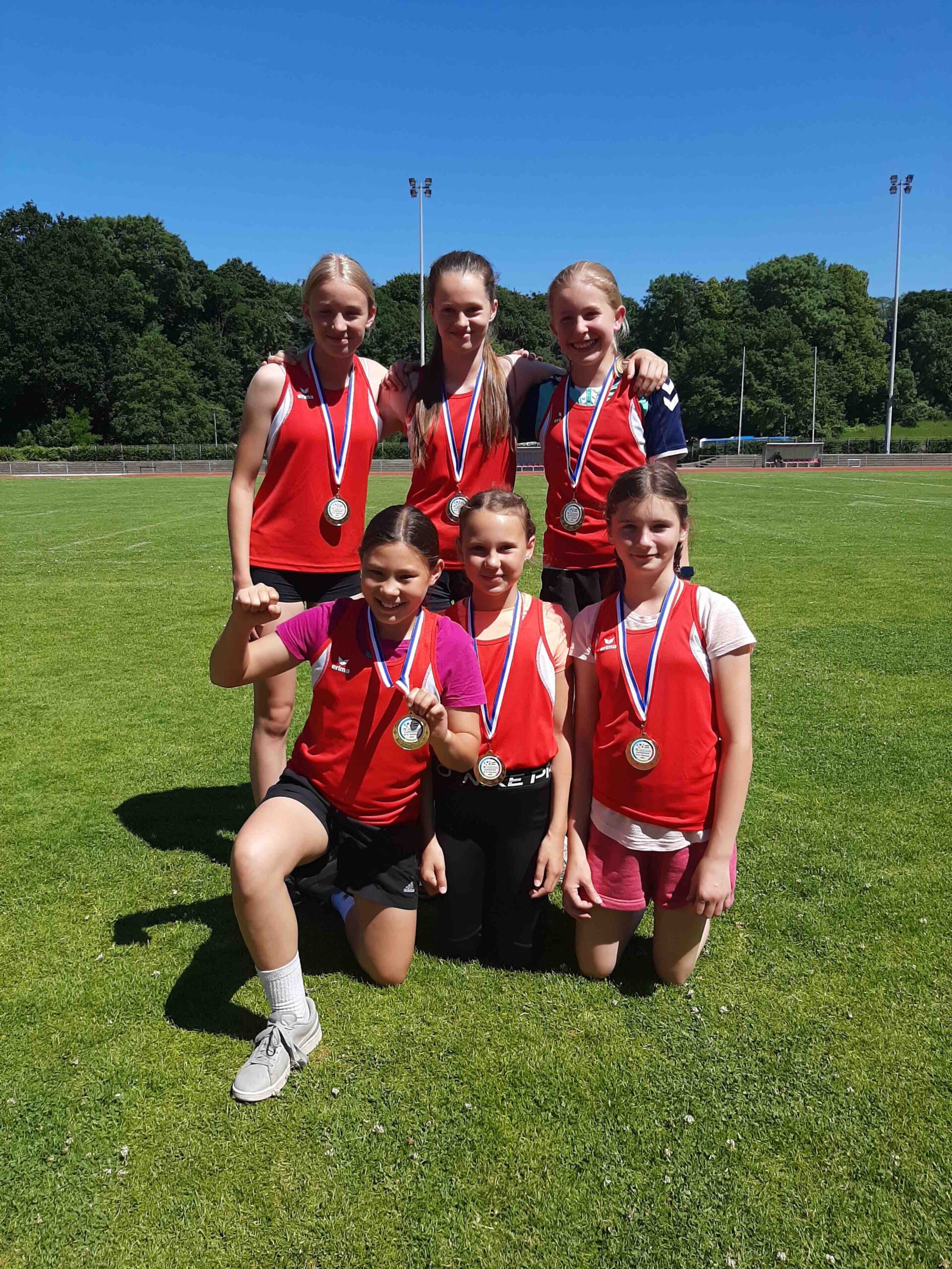 Grenzenloser Jubel nach einer tollen Teamleistung – Die WII-Mädchen Paula Schnack, Jette Overbeck, Theresa Grelck, Alina Köster, Jule Gurk, Ricarda Kondrat, Lara Wichmann, Zoe Haertle (hintere Reihe v.l.), Karla Mesch, Paula Hadenfeldt, Klara Schnack und Jette Heer (vordere Reihe v.l.) freuten sich über Platz zwei auf dem Siegertreppchen.