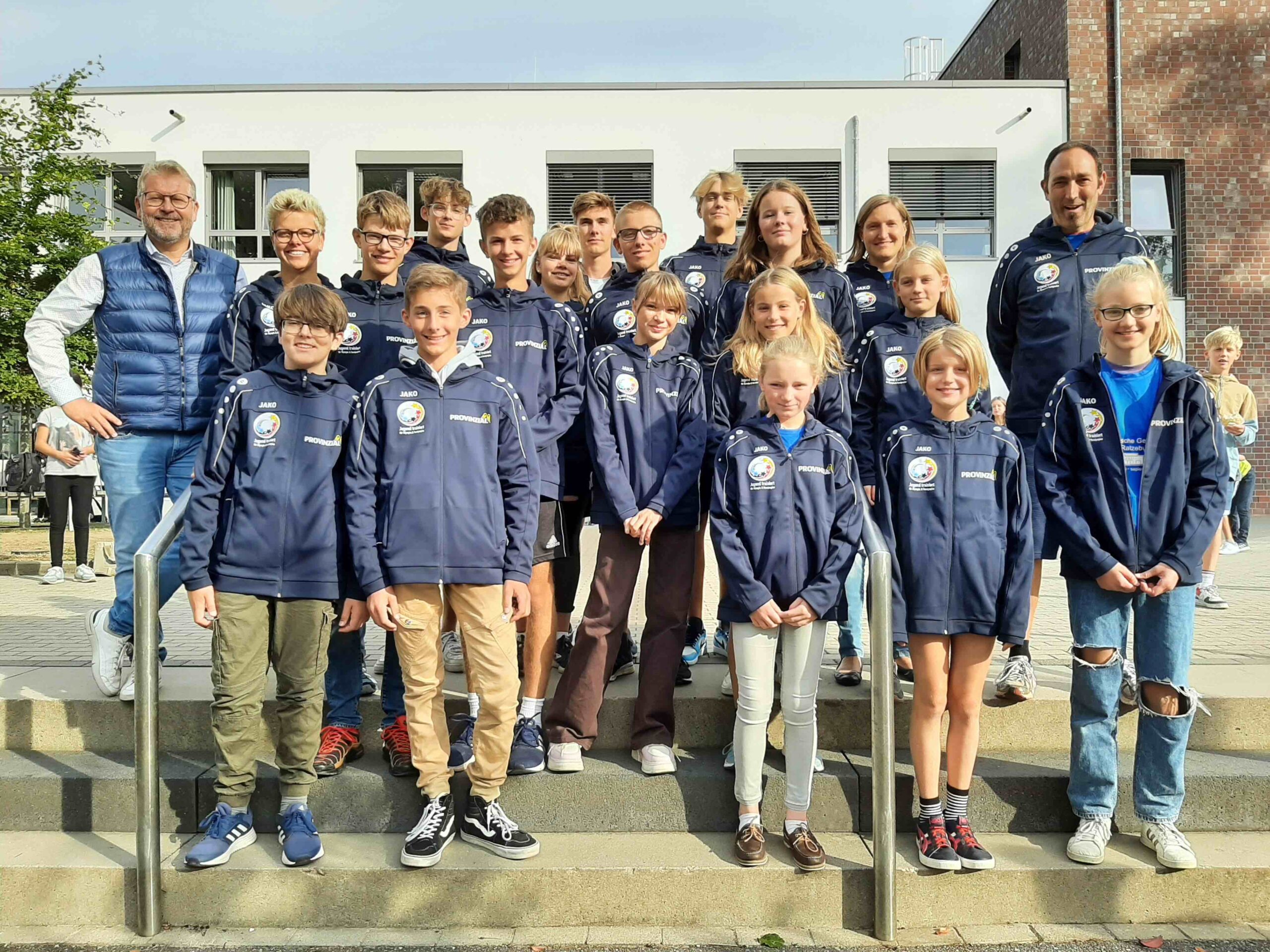 Drei Schulmannschaften der Lauenburgischen Gelehrtenschule Ratzeburg schafften in diesem Jahr die Qualifikation zum Bundesfinale nach Berlin: Zwei Ruder-Vierer und ein Schwimm-Team holten sich auf Landesebene den Titel und dürfen nun für fünf Tage die schleswig-holsteinischen Farben in der Bundeshauptstadt vertreten.Am kommenden Dienstag (13.9.) geht es los – und genau eine Woche vorher wurden die LG-Schüler mit neuem Outfit ausgestattet. Der Ratzeburger Provinzial-Chef Sönke Brüdersdorf ließ es sich nicht nehmen, die Trainingsjacken persönlich zu übergeben und den Jungen und Mädchen vor dem Schulportal alles Gute für das Bundesfinale zu wünschen. Die Schwimmmannschaft (WIV, Mädchen) fiebert ihrer Premiere entgegen und auch bei den Jungen (WII und WIII) aus den beiden Ruder-Vierern gibt es keinerlei Erfahrung, was die Teilnahme am Bundesfinale „Jugend trainiert für Olympia“ angeht. Denn 2020 und 2021 fiel das Event Corona zum Opfer. So ist die Vorfreude bei allen groß, die LG würdig in der Hauptstadt zu vertreten und neben dem eigenen Wettkampf die anderen Sportler, den Empfang in der Schleswig-Holsteinischen Botschaft und weitere Berlin-Highlights zu erleben.