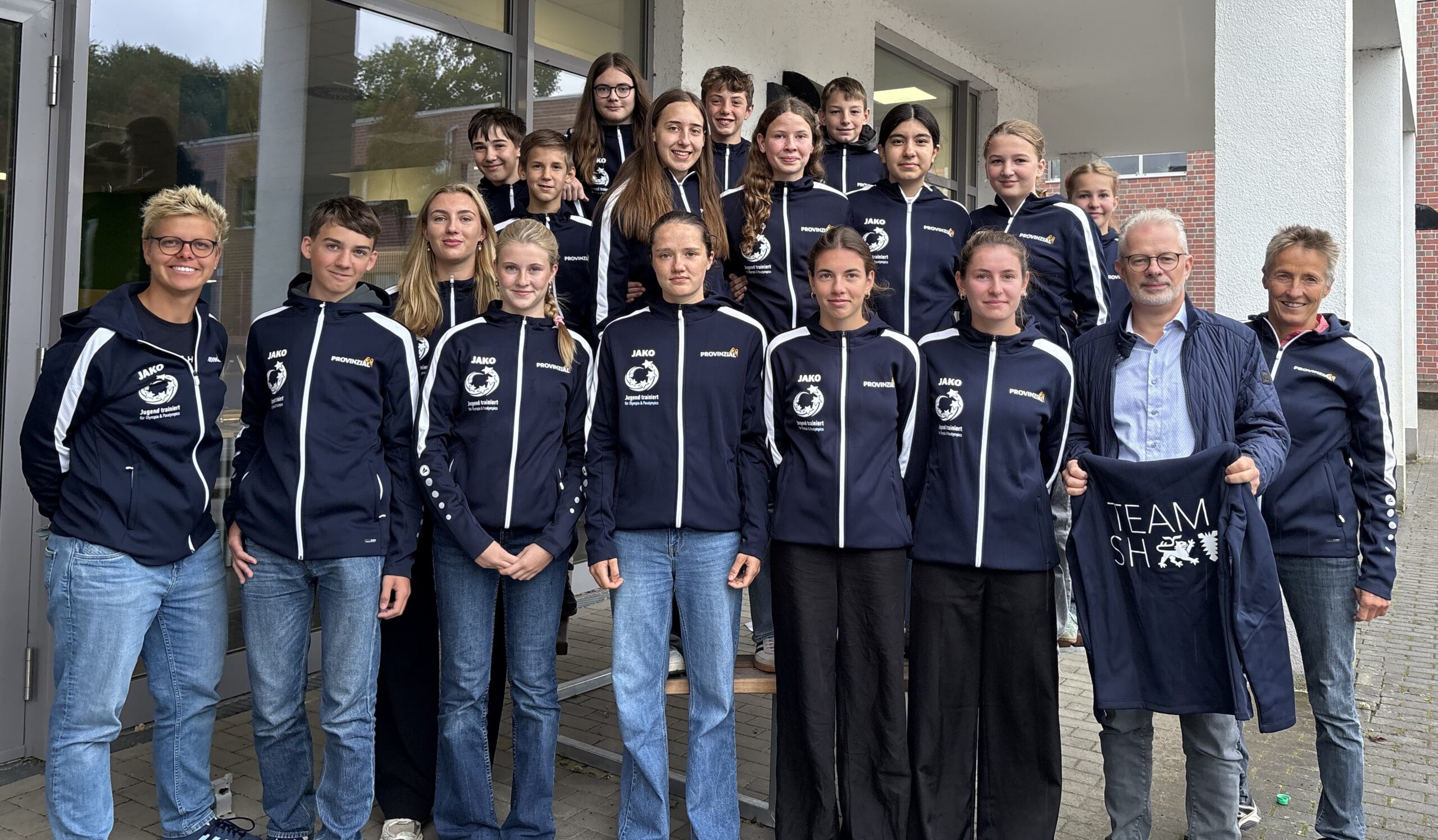 Mit schicken neuen Jacken starten die LG-Sportler nächste Woche zum Bundesentscheid nach Berlin: Ruderer und Judoka wurden von Vivian Koch (2.v.re) von der Provinzial Ratzeburg mit Trainingspullovern ausgestattet, die sie als „Team SH“ und als erkennbare Landesmeister in der Hauptstadt kennzeichnen.