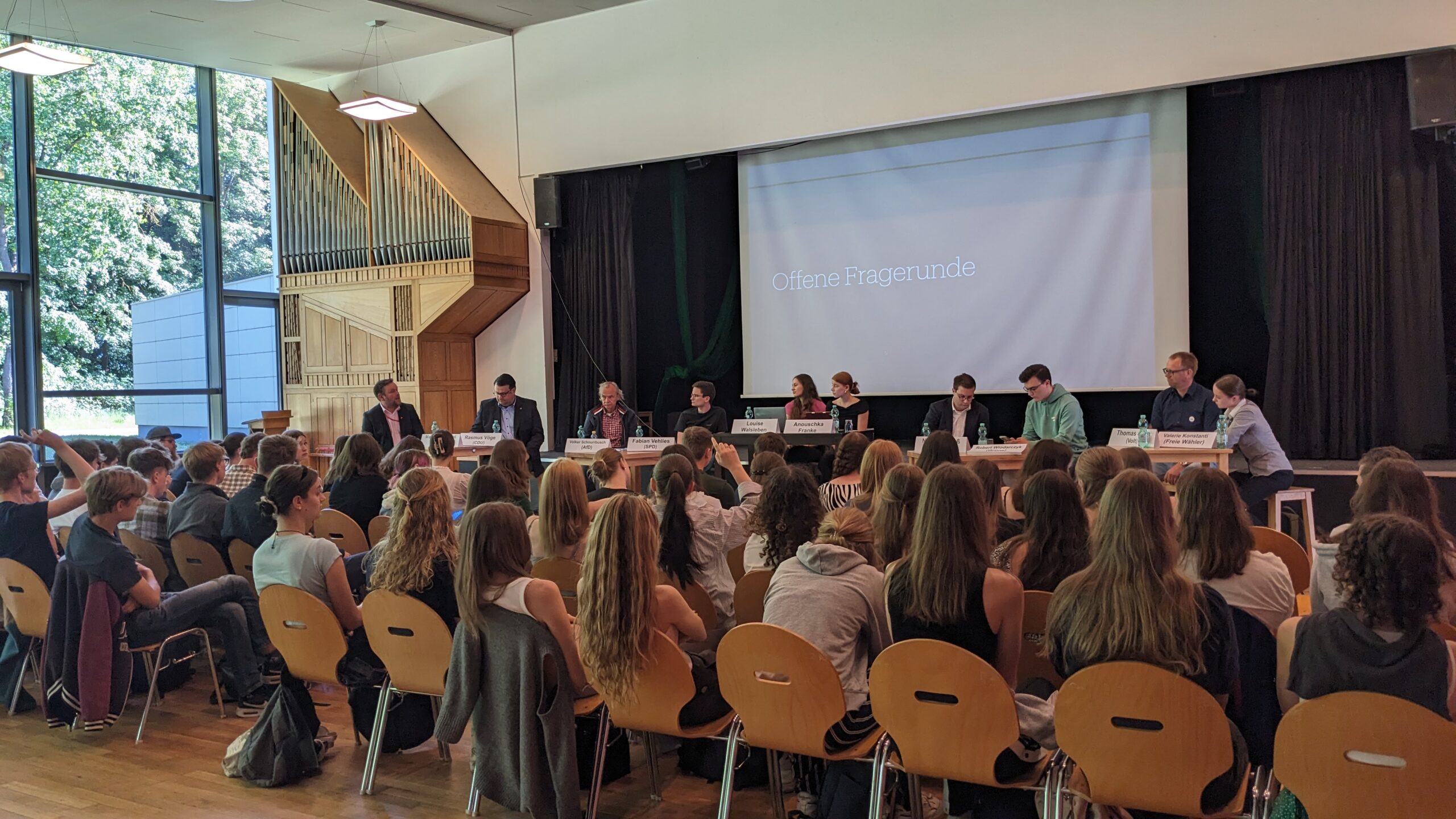 Abschließend kann ich persönlich nur sagen, dass ich die Veranstaltung interessant und aufschlussreich fand, aber auch sehr unterhaltsam. Solche Events finde ich durchaus wichtig, um einen Einblick in die verschiedenen Parteien und deren Positionen zu bekommen und Politikerinnen und Politiker aus nächster Nähe zu erleben. Besonders für diejenigen, die vorher noch unentschlossen waren, wen genau sie nun wählen sollen, kann dies bei der Entscheidungsfindung durchaus helfen, auch wenn einige Beteiligte ihre Partei und deren Programm besser repräsentieren konnten als andere. Die Tatsache, dass die Veranstaltung noch in die Pause gezogen wurde und niemand aus der Schülerschaft den Raum verlies, zeigte doch, wie erfolgreich diese war. An dieser Stelle sollten wir unseren beiden Moderatorinnen Anouschka und Louise ein großes Lob für ihre sorgfältige Vorbereitung und souveräne Moderation aussprechen.