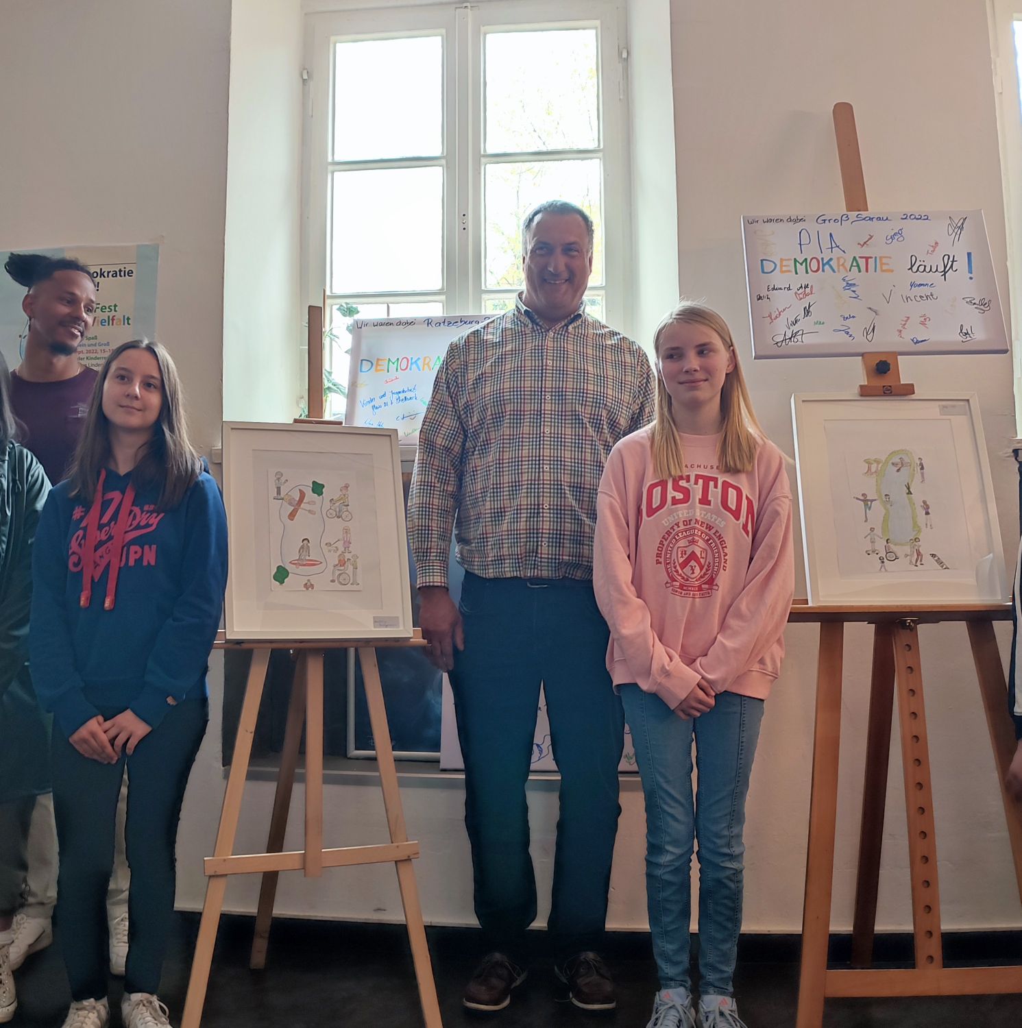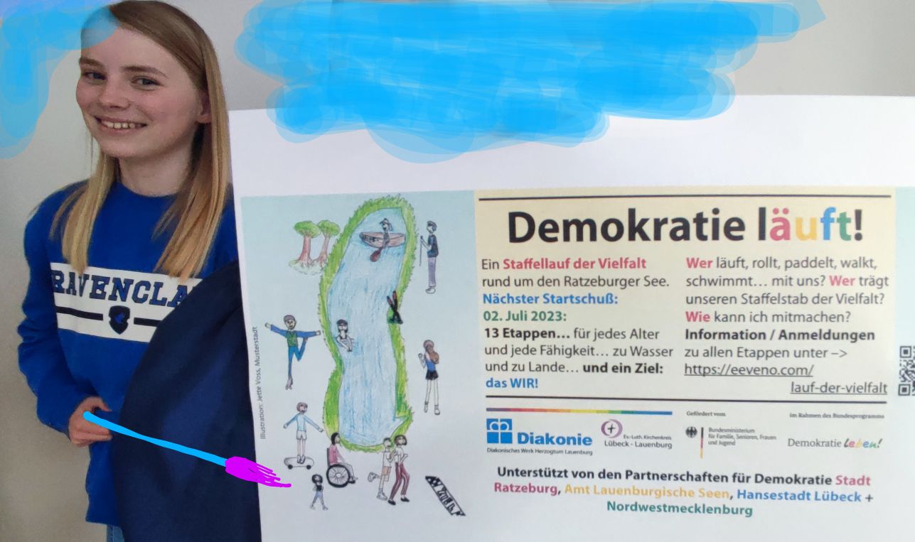 Der Wettbewerb „Demokratie läuft“, an dem sich die Klassen 6b und 6c im Rahmen des Kunstunterricht bei Frau Wilk-Kähler beteiligt haben, wurde vom Diakonischen Werk Herzogtum Lauenburg des Kirchenkreises Lübeck-Lauenburg und der Stadt Ratzeburg ausgeschrieben.