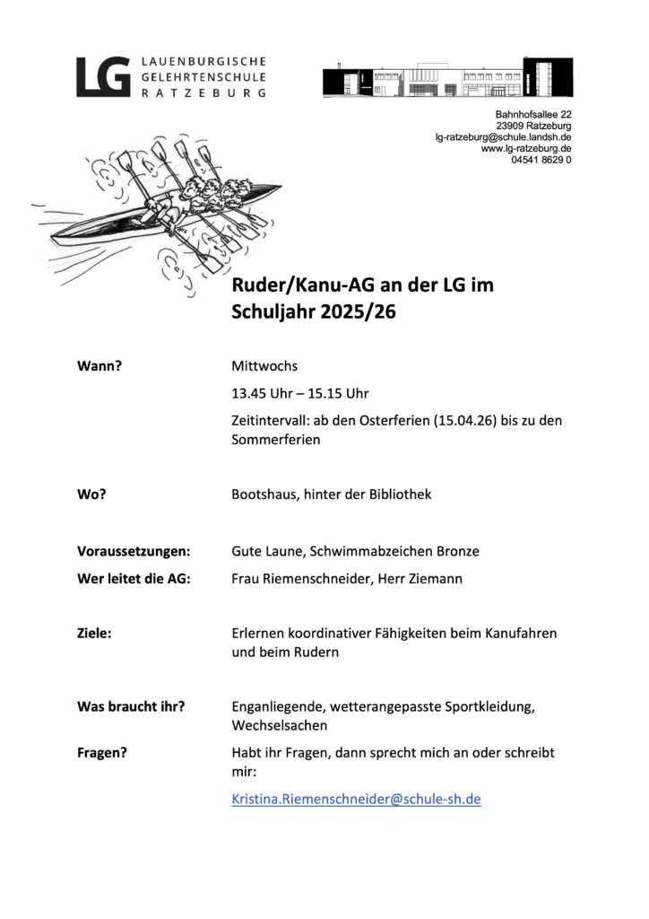 Homepage AG 20. März 2026 Allgemein Hier findet ihr die Ausschreibung zur Ruder-AG: Beitragsnavigation Zurück Vorheriger Beitrag: Schulverein und Patenschüler ermöglichen das FaschingsfestWeiter Nächster Beitrag: Mit „Silke“ allzeit gute Fahrt